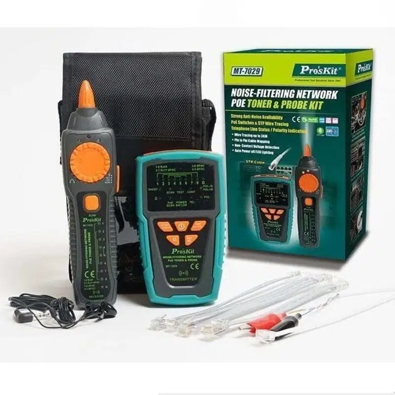 Proskit MT-7029N kablo bulucu ve toner probe cihazı; network, telefon ve veri hatlarında kablo izleme, hat tespiti ve arıza analiz işlemleri için geliştirilmiş profesyonel test cihazıdır. RJ45 ve RJ11 bağlantı desteği ile LAN ve telefon kablolarında hızlı test imkanı sunar. 300 metreye kadar kablo haritalama ve 3 km’ye kadar kablo izleme kapasitesi sayesinde uzun mesafeli hatlarda etkin kullanım sağlar. EMI filtreleme teknolojisi ile yüksek frekanslı parazitleri azaltarak daha hassas kablo takibi yapılmasına yardımcı olur. Süreklilik, kısa devre, açık devre, çapraz bağlantı ve pin dizilim testi fonksiyonları ile kapsamlı analiz sağlar. PoE tespiti, telefon hattı polarite kontrolü ve temassız voltaj algılama özellikleri sayesinde network kurulum, bakım ve saha servis işlemlerinde ideal çözümdür.